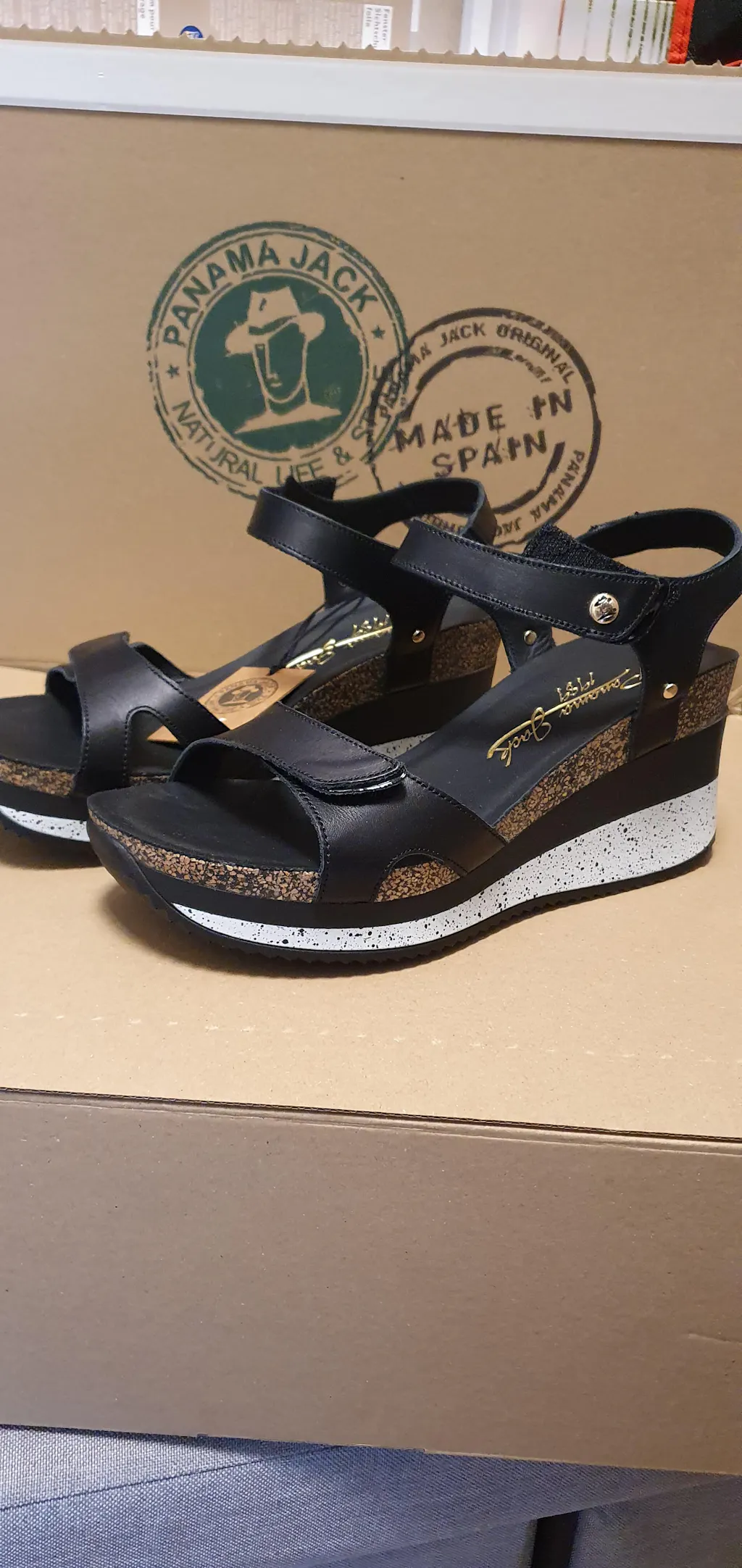 Wedge sandals. WATERPROOF Black Napa Leather. Velcro Closure. Leather lining. Anatomical insole. Flexible and durable cork and Polyurethane sole. Heel height: 7 cm. 100% Made in Spain.